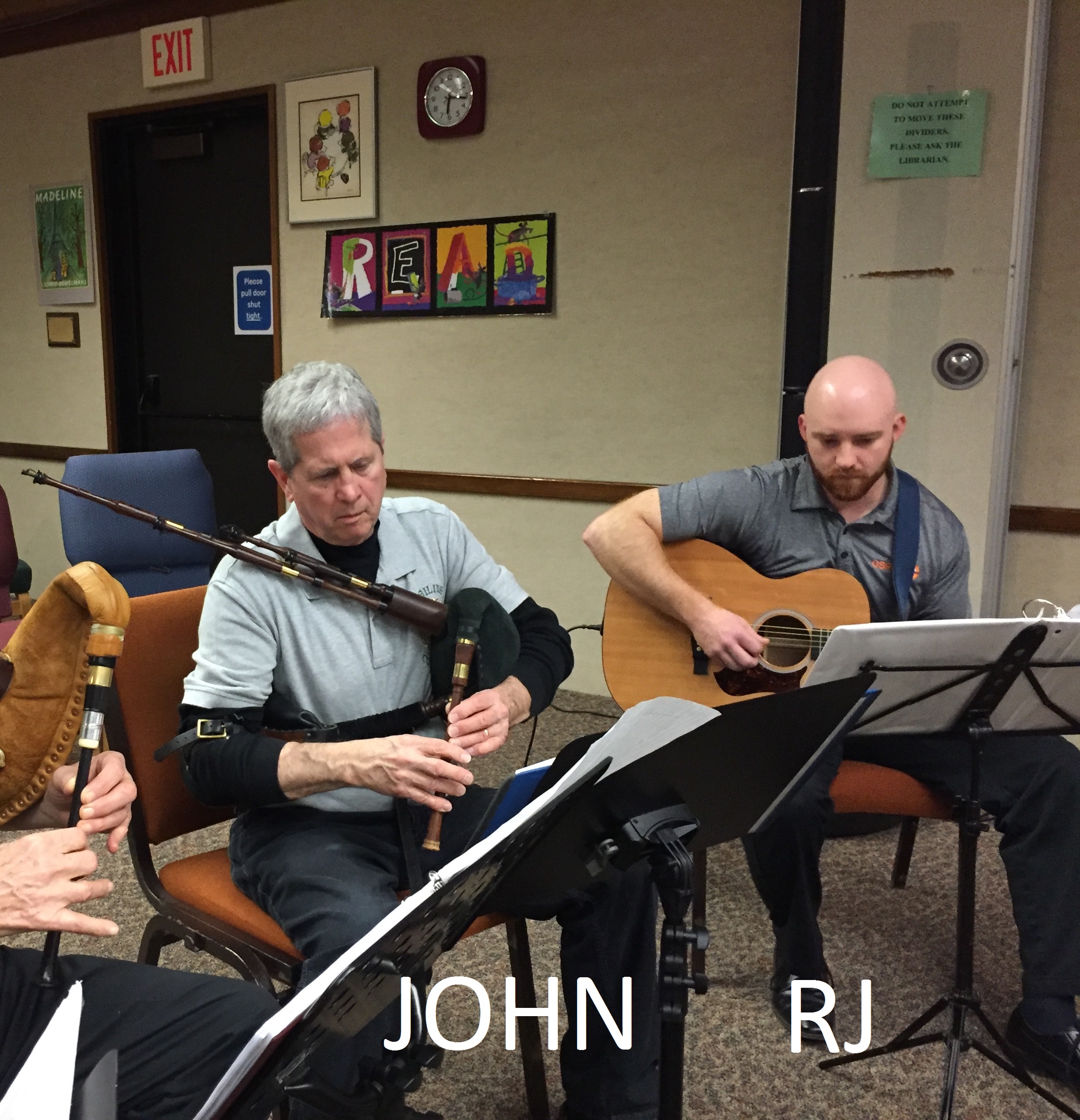 RJ has recently (March 2017) joined us. He works with John and at lunch time the two would get together and play tunes, RJ on guitar and John on small pipes. It adds such a lovely dimension to the pipe music! The group appreciated the addition of his guitar music and he enjoys playing with the pipes. It makes for a rich combination.